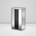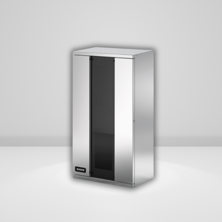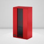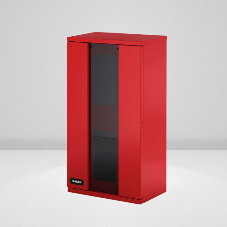 Steel fire extinguisher holder with a sophisticated design and bold, distinctive square lines. The fire extinguisher holder features a magnetic closure and a lid with a safety seal. Wall or floor-standing mount.